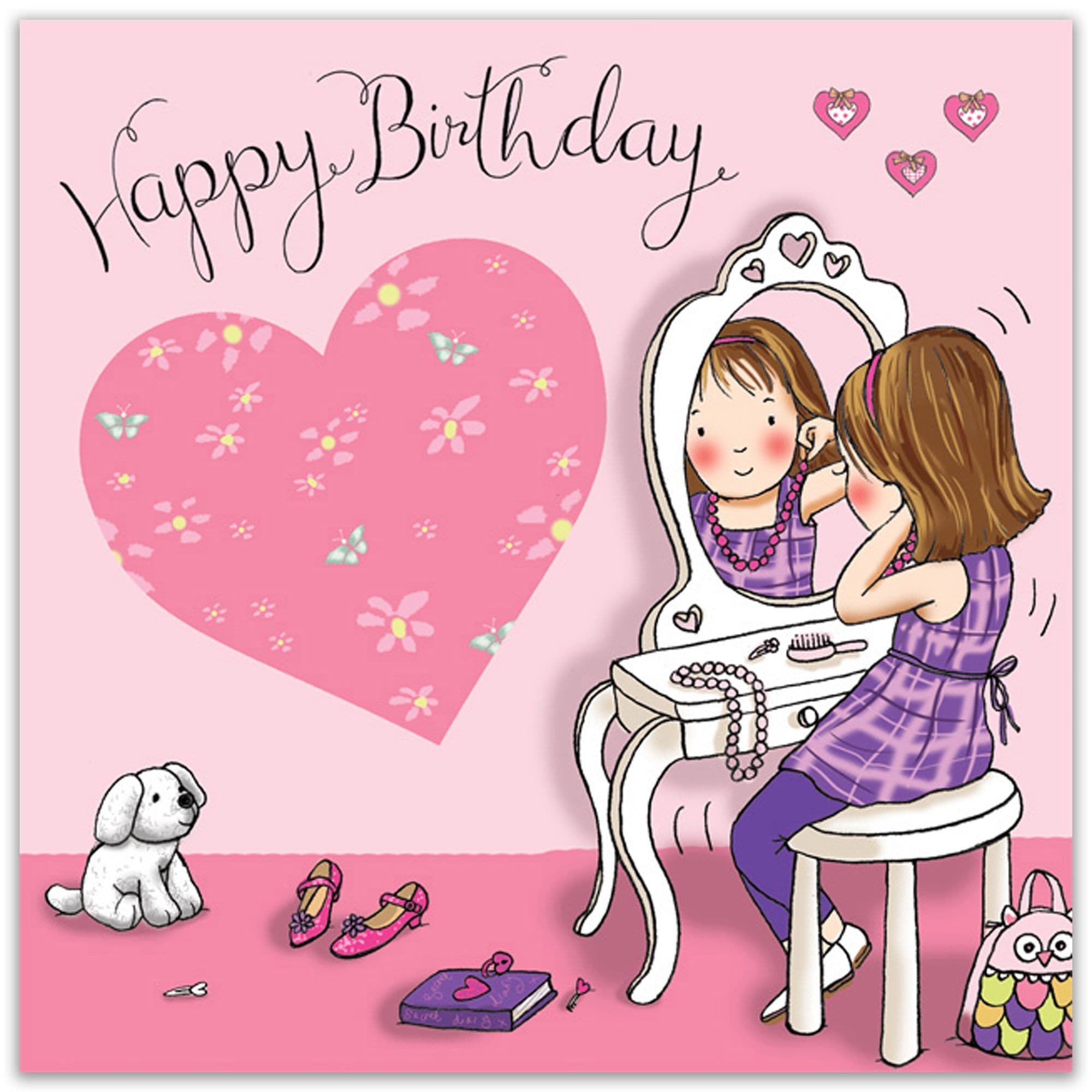 A gorgeous card to mark a special little girls birthday. It features a little girl trying on a pretty necklace whilst sat at her dressing table, with a pink heart in the background. A lovely card to send birthday wishes on a special birthday. This card is blank inside for your own message.