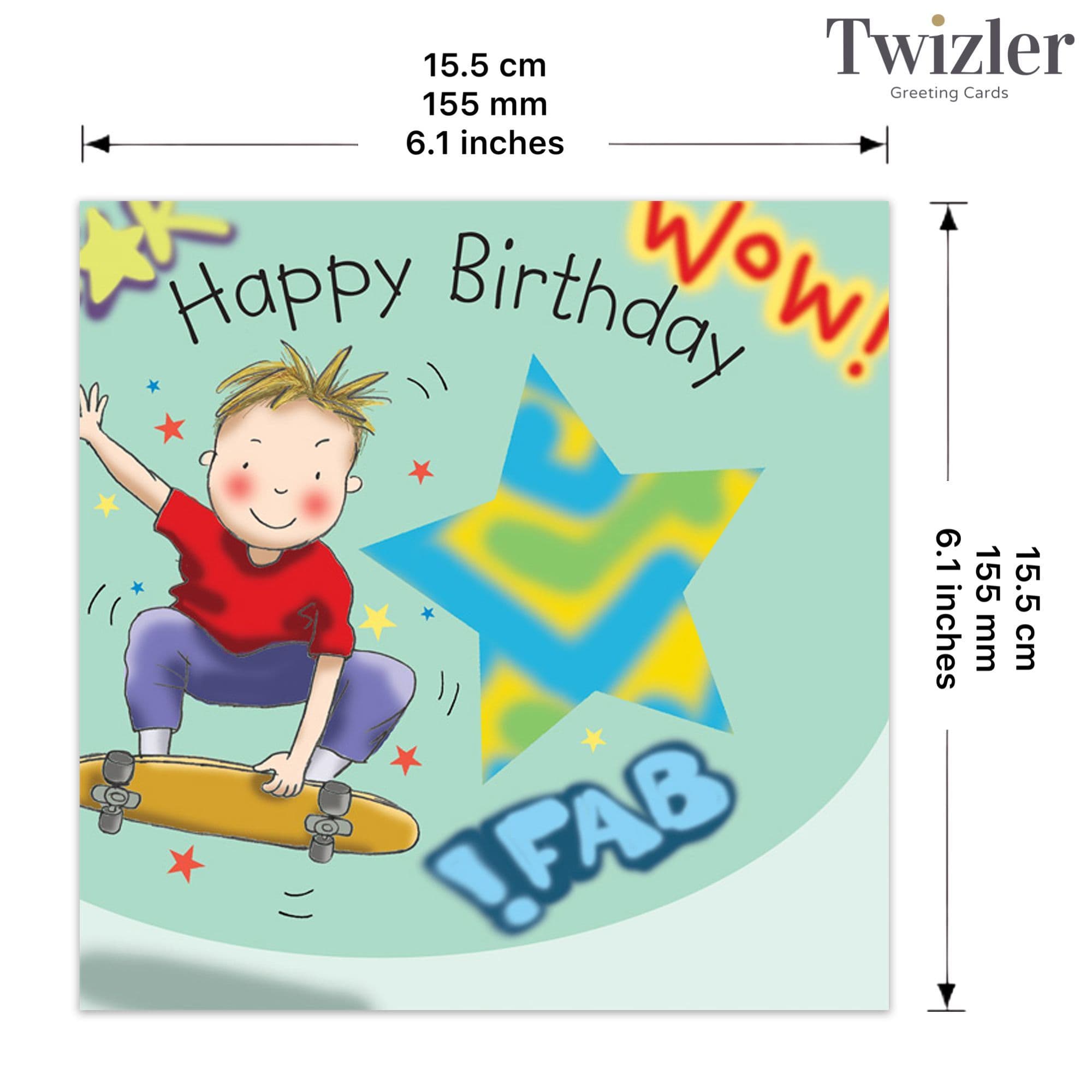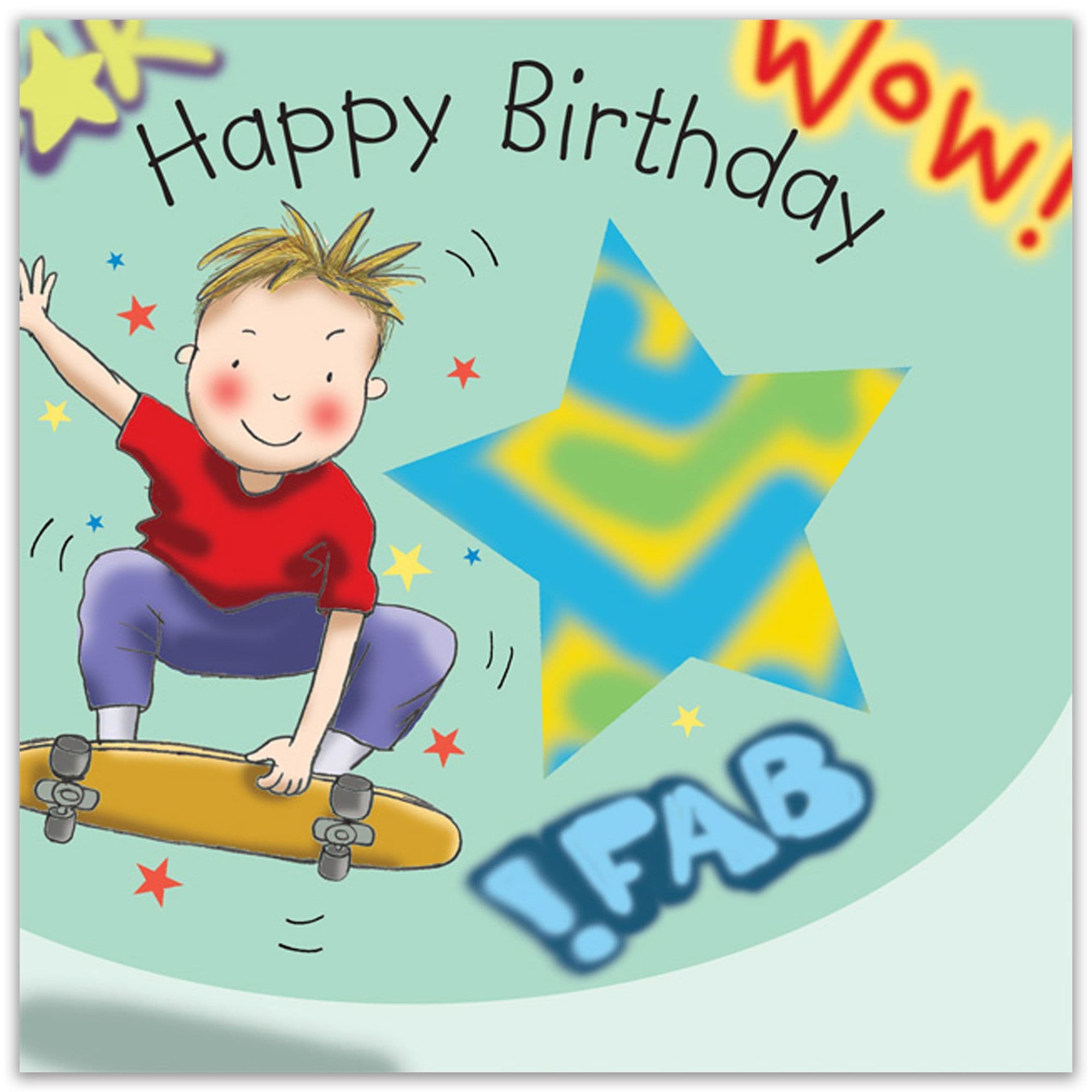 A brilliant birthday card to mark a special boys birthday. It features a cute boy playing on his new skateboard with graffitied Wow! FAB! in the background. The perfect choice for a special boys birthday. This card is blank inside for your own message.